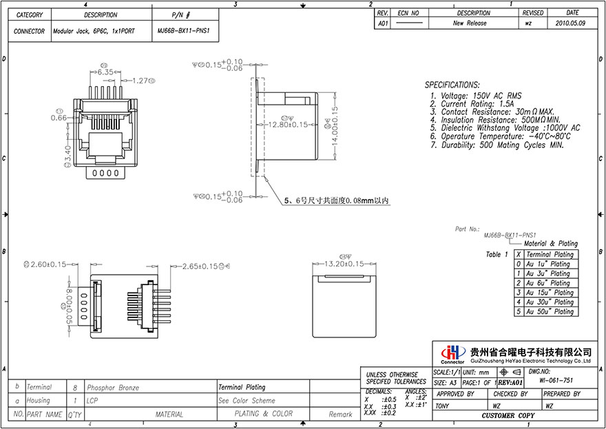MJ66B-BX11-PNS1 180 degree 6P6C all plastic SMT