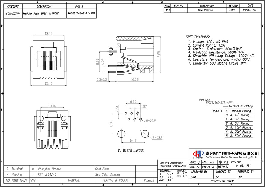 MJ522266E-BX11-PN1 6P6C 1X1 all plastic with ears